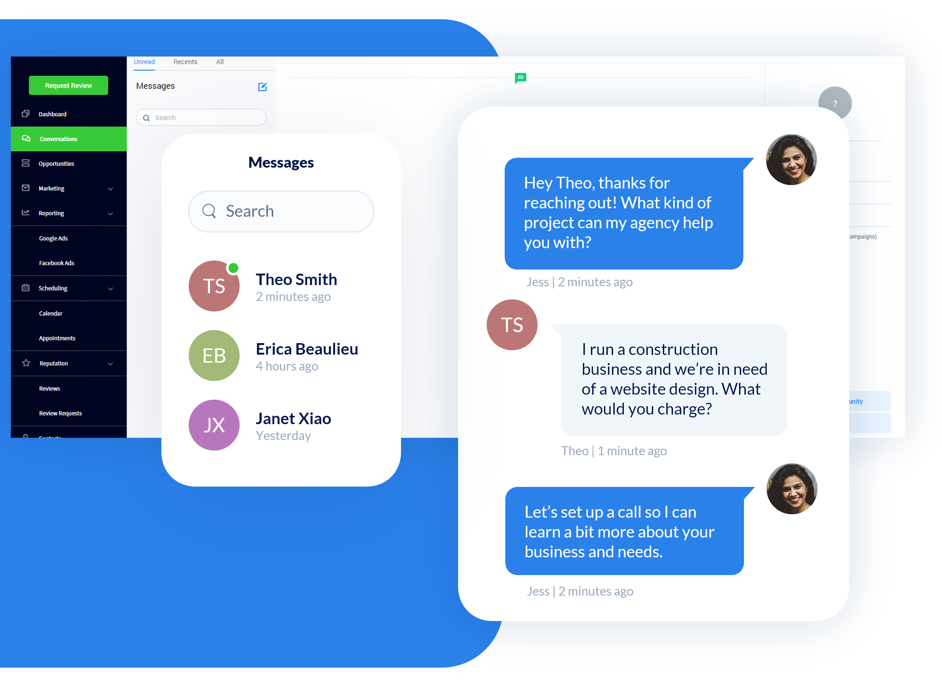 The days are gone where you have to have separate apps or platforms to get your messages! Keep track of conversations whether they happen via text message, chat widget, GMB messages, email, phone calls, or Facebook messages ALL IN ONE PLACE. Two-way text included!