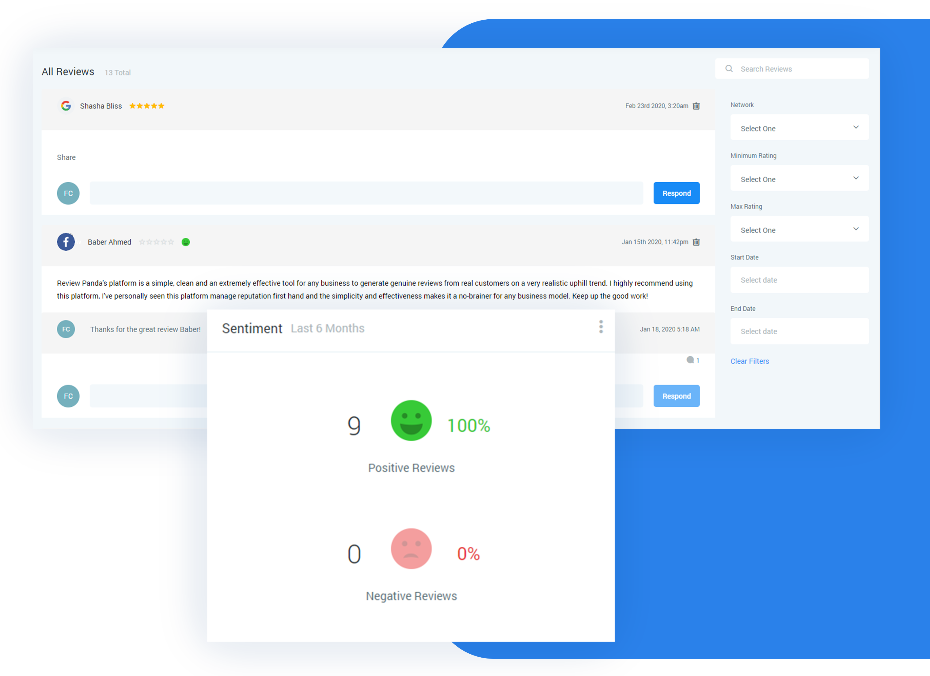 Send review requests via text and email with the push of a button. Monitor and reply to new reviews right within the dashboard.